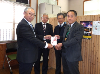 | 当組合では例年、緑の募金を行っています。当組合の原理事長から、公益財団法人山梨県緑化推進機構機構の鷹野代表理事に募金の贈呈を行いました。 | |